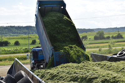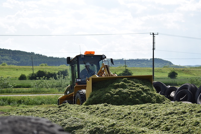 収穫した牧草はバンカーサイロまで運び、タイヤショベル等を用いて踏圧されながら積まれます。最後に雨風が当たらないようラップをかけ、おもりをのせて完成です。ラップの中で発酵が終わると牛たちに与えるサイレージになります。