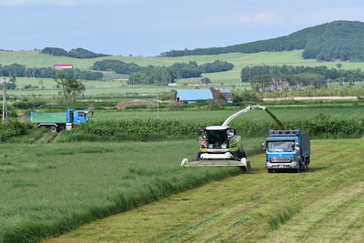 収穫には大型の牧草ハーベスタを用い、大型ダンプを並走させ収穫と同時に積載を行っています。このハーベスタは収穫と同時に牧草を適した長さに裁断することが出来ます。